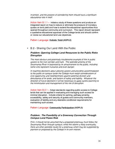 • B.2 - Sharing Our Land With the Public Problem: Opening College Land Resources to the Public Risks Disruption The most obvious and potentially troublesome example of this is public access to the river corridor and trails. The splendid amenity of the Swannanoa River is balanced by its attractiveness to the public, including some who represent nuisance and even danger. In reaching decisions about allowing access and providing accommodation to the public on campus lands the College must weigh considerations of civic opportunity and neighborliness against potential division and disturbance of its lands, and factors of safety and liability. Whatever the direction of future decisions it will be necessary to apply careful planning to the minimization and management of the risk of disruption.