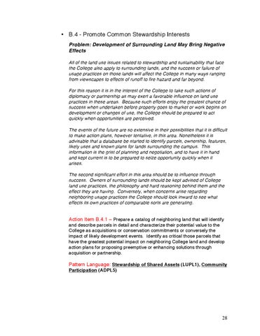 • B.4 - Promote Common Stewardship Interests Problem: Development of Surrounding Land May Bring Negative Effects All of the land use issues related to stewardship and sustainability that face the College also apply to surrounding lands, and the success or failure of usage practices on those lands will affect the College in many ways ranging from viewscapes to effects of runoff to fire hazard and far beyond. For this reason it is in the interest of the College to take such actions of diplomacy or partnership as may exert a favorable influence on land use practices in these areas. Because such efforts enjoy the greatest chance of success when undertaken before property goes to market or work begins on development or changes of use, the College should be prepared to act quickly when opportunities are perceived. The events of the future are so extensive in their possibilities that it is difficult to make action plans, however tentative, in this area. Nonetheless it is advisable that a database be started to identify parcels, ownership, features, likely uses and known plans for lands surrounding the campus. This information is the grist of planning and negotiation, and to have it in hand and kept current is to be prepared to seize opportunity quickly when it arises. The second significant effort in this area should be to influence through success. Owners of surrounding lands should be kept advised of College land use practices, the philosophy and hard reasoning behind them and the effect they are having. Conversely, when concerns arise regarding neighboring usage practices the College should look inward to see what effects its own practices of comparable sorts are generating.