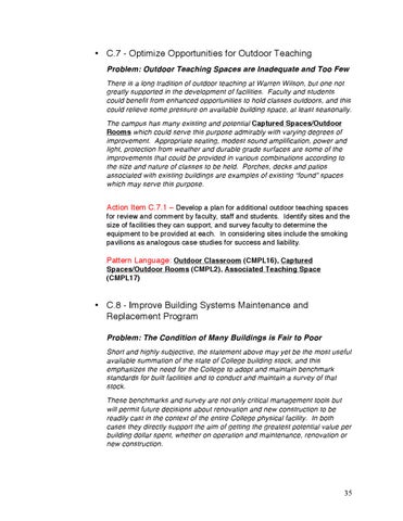 • C.7 - Optimize Opportunities for Outdoor Teaching Problem: Outdoor Teaching Spaces are Inadequate and Too Few There is a long tradition of outdoor teaching at Warren Wilson, but one not greatly supported in the development of facilities. Faculty and students could benefit from enhanced opportunities to hold classes outdoors, and this could relieve some pressure on available building space, at least seasonally. The campus has many existing and potential Captured Spaces/Outdoor Rooms which could serve this purpose admirably with varying degrees of improvement. Appropriate seating, modest sound amplification, power and light, protection from weather and durable grade surfaces are some of the improvements that could be provided in various combinations according to the size and nature of classes to be held. Porches, decks and patios associated with existing buildings are examples of existing “found” spaces which may serve this purpose.