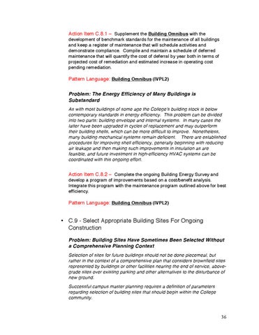 Pattern Language: Building Omnibus (IVPL2) Problem: The Energy Efficiency of Many Buildings is Substandard As with most buildings of some age the Collegeʼs building stock is below contemporary standards in energy efficiency. This problem can be divided into two parts: building envelope and internal systems. In many cases the latter have been upgraded in cycles of replacement and may outperform their building shells, which can be more difficult to improve. Nonetheless, many building mechanical systems remain deficient. There are established procedures for improving shell efficiency, generally beginning with reducing air leakage and then making such improvements in insulation as are feasible, and future investment in high-efficiency HVAC systems can be coordinated with this ongoing effort.