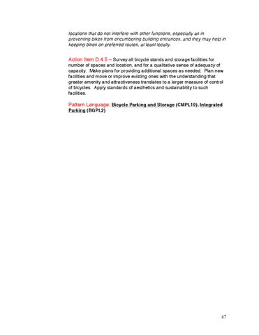 Action Item D.4.5 – Survey all bicycle stands and storage facilities for number of spaces and location, and for a qualitative sense of adequacy of capacity. Make plans for providing additional spaces as needed. Plan new facilities and move or improve existing ones with the understanding that greater amenity and attractiveness translates to a larger measure of control of bicycles. Apply standards of aesthetics and sustainability to such facilities.