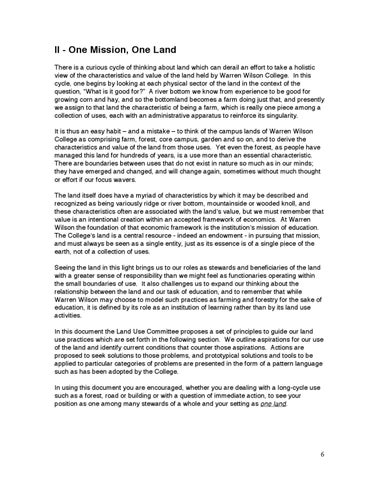 II - One Mission, One Land There is a curious cycle of thinking about land which can derail an effort to take a holistic view of the characteristics and value of the land held by Warren Wilson College. In this cycle, one begins by looking at each physical sector of the land in the context of the question, “What is it good for?” A river bottom we know from experience to be good for growing corn and hay, and so the bottomland becomes a farm doing just that, and presently we assign to that land the characteristic of being a farm, which is really one piece among a collection of uses, each with an administrative apparatus to reinforce its singularity. It is thus an easy habit – and a mistake – to think of the campus lands of Warren Wilson College as comprising farm, forest, core campus, garden and so on, and to derive the characteristics and value of the land from those uses. Yet even the forest, as people have managed this land for hundreds of years, is a use more than an essential characteristic. There are boundaries between uses that do not exist in nature so much as in our minds; they have emerged and changed, and will change again, sometimes without much thought or effort if our focus wavers. The land itself does have a myriad of characteristics by which it may be described and recognized as being variously ridge or river bottom, mountainside or wooded knoll, and these characteristics often are associated with the landʼs value, but we must remember that value is an intentional creation within an accepted framework of economics. At Warren Wilson the foundation of that economic framework is the institutionʼs mission of education. The Collegeʼs land is a central resource - indeed an endowment - in pursuing that mission, and must always be seen as a single entity, just as its essence is of a single piece of the earth, not of a collection of uses. Seeing the land in this light brings us to our roles as stewards and beneficiaries of the land with a greater sense of responsibility than we might feel as functionaries operating within the small boundaries of use. It also challenges us to expand our thinking about the relationship between the land and our task of education, and to remember that while Warren Wilson may choose to model such practices as farming and forestry for the sake of education, it is defined by its role as an institution of learning rather than by its land use activities. In this document the Land Use Committee proposes a set of principles to guide our land use practices which are set forth in the following section. We outline aspirations for our use of the land and identify current conditions that counter those aspirations. Actions are proposed to seek solutions to those problems, and prototypical solutions and tools to be applied to particular categories of problems are presented in the form of a pattern language such as has been adopted by the College. In using this document you are encouraged, whether you are dealing with a long-cycle use such as a forest, road or building or with a question of immediate action, to see your position as one among many stewards of a whole and your setting as one land.