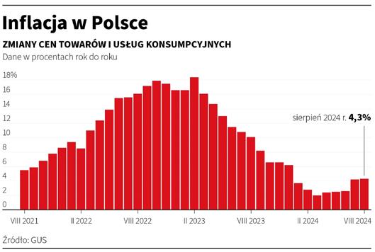 Inflation in Poland in August was 4.3 % year-on-year, the Central Statistical Office ( GUS ) reported.