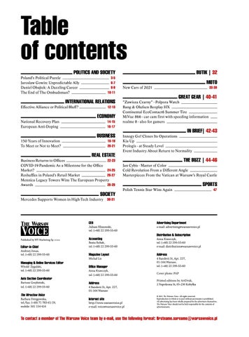 Table of contents POLITICS AND SOCIETY Poland’s Political Puzzle Jarosław Gowin: Unpredictable Ally Daniel Obajtek: A Dazzling Career The End of The Ombudsman?