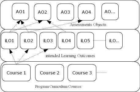The proposed model is based on evaluating each ILO based on the actual students’ performance at the related assignment objects. As shown in Figure1, the model is consists of three layers. The bottom layer consists of program courses that need to be reviewed and evaluated. The second layer consists of predefined lists of courses’ ILOs. When designing a course, the instructional designer usually starts by defining all courses’ ILOs within the course syllabus. These ILOs need to be aligned with the overall program learning outcomes as well. The Third Layer consists of a list of assessment objects AOs. The assessment object could have different levels of granularity. It could be as small as a single exam question or as large as a final course project. It is up to the course instructor to define these assessment objects and to relate them to specific ILOs.