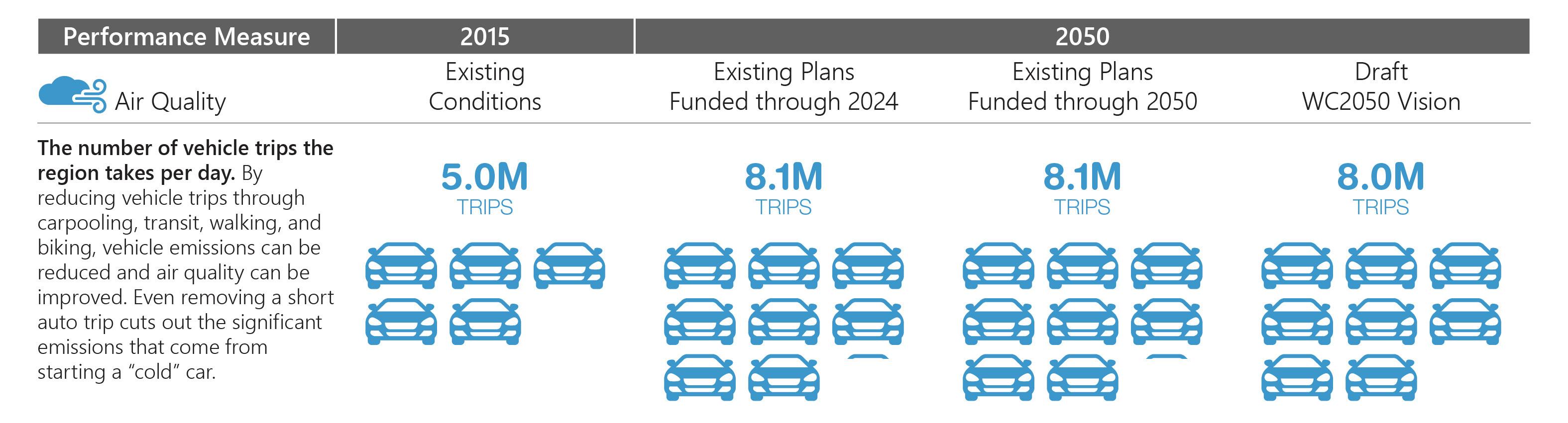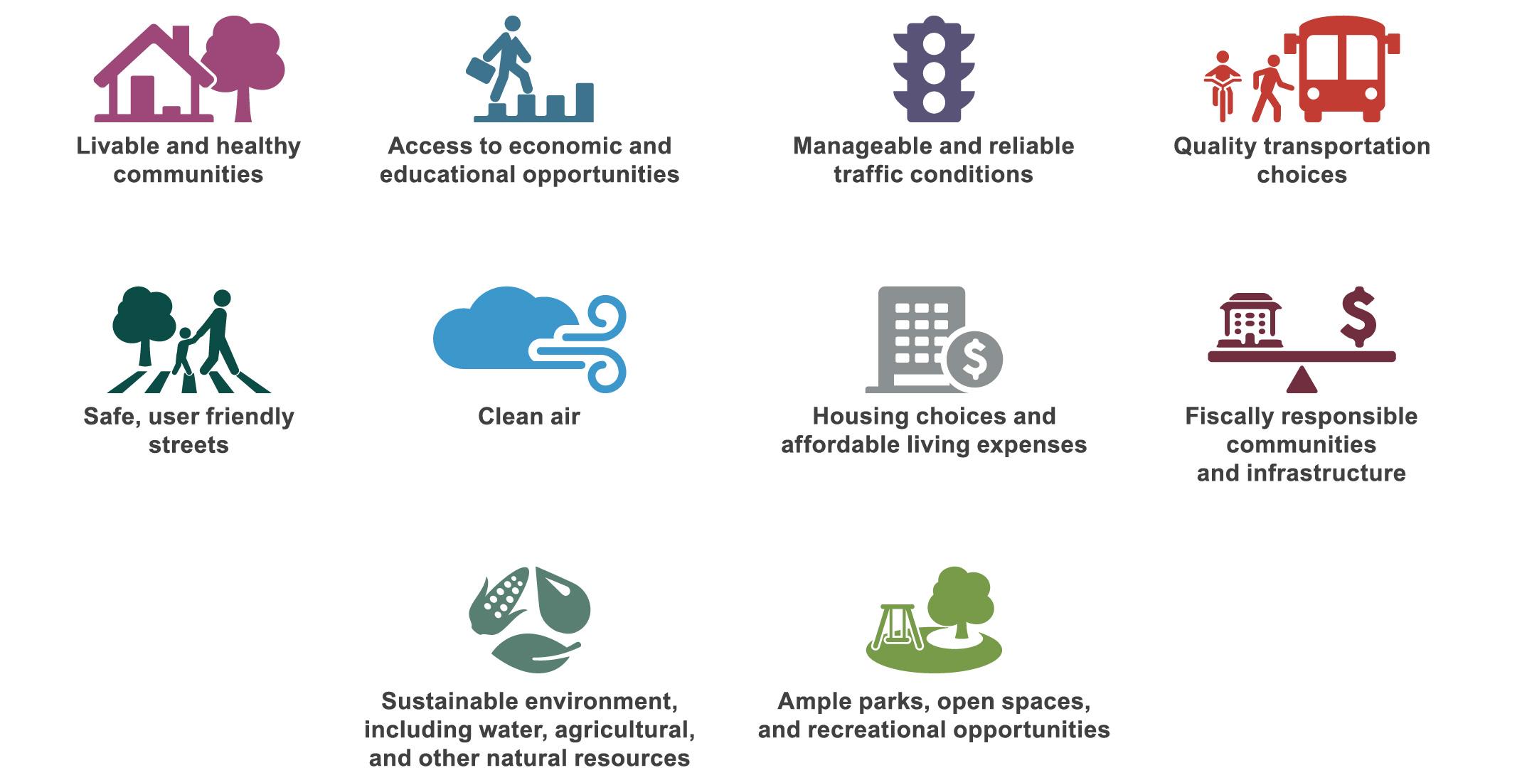 Therefore, the 2019-2050 RTP is considered within a broad perspective of how transportation infrastructure can work with both land and economic development decisions to maximize overall quality of life. Key quality of life issues, such as mobility, affordability, and air quality, are considered through the lens of not just transportation decisions, but also by how growth patterns should unfold. For example, questions of where and what type of homes and jobs are developed will in turn affect how far people choose to travel, and