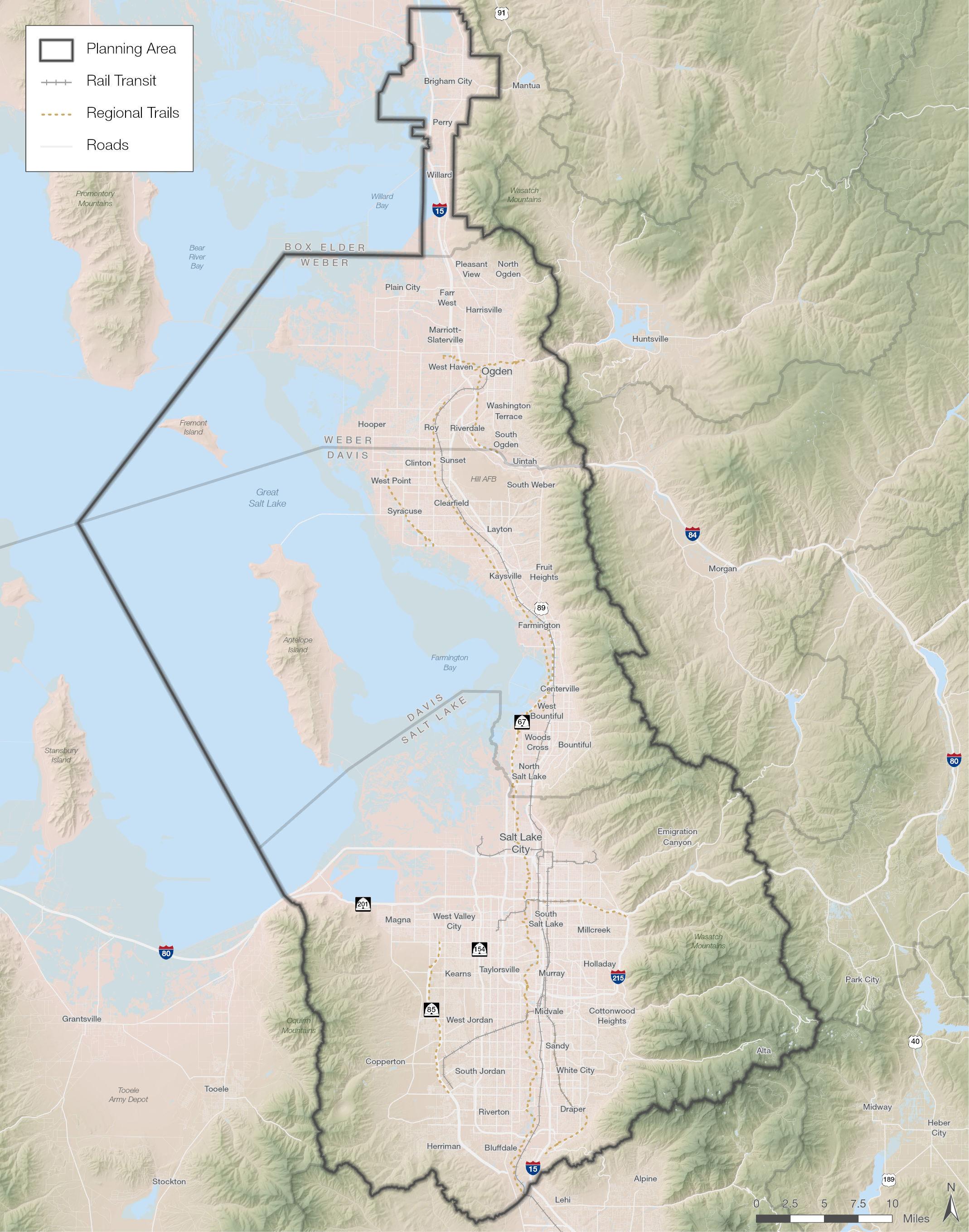 The Wasatch Front Regional Council (WFRC) developed the 2019-2050 RTP with residents, local government stakeholders, and partner agencies. Map 1 shows the planning boundary for WFRC. The 2019-2050 RTP is informed by technical modeling and forecasting to help us understand how it might achieve regional quality of life goals. This includes ensuring that as we invest in transportation, we meet important air quality standards.