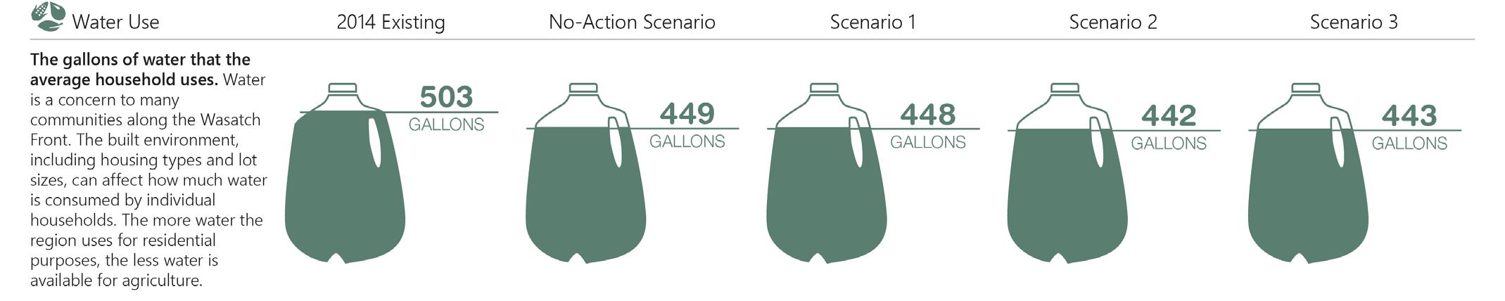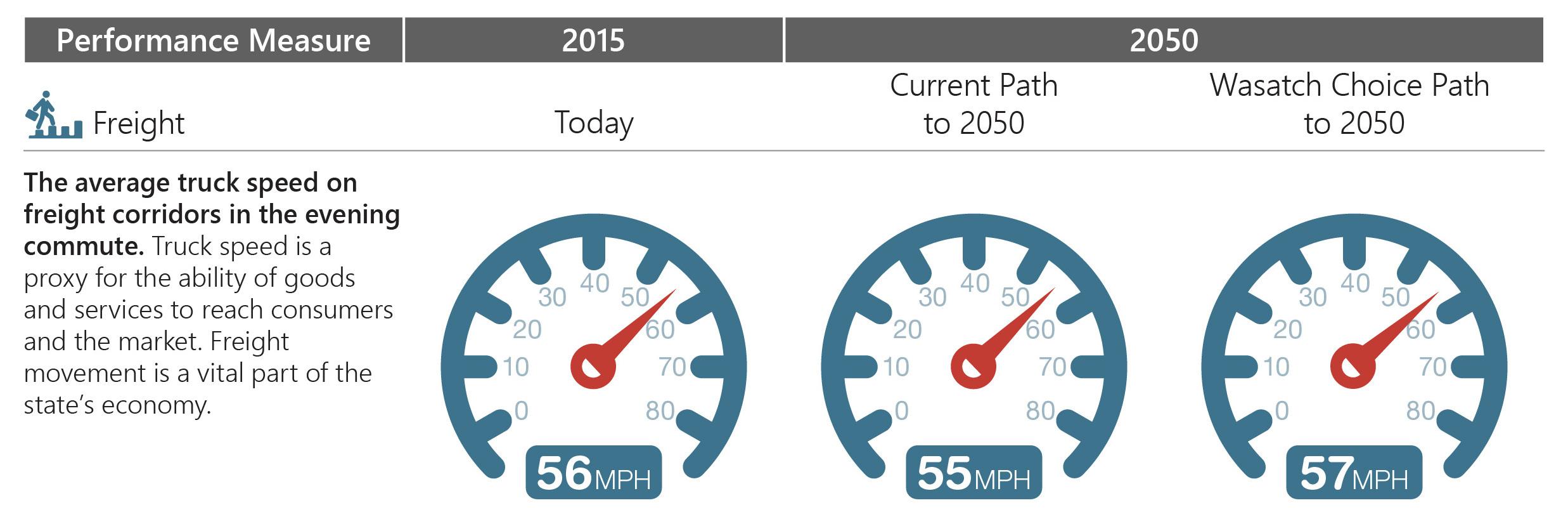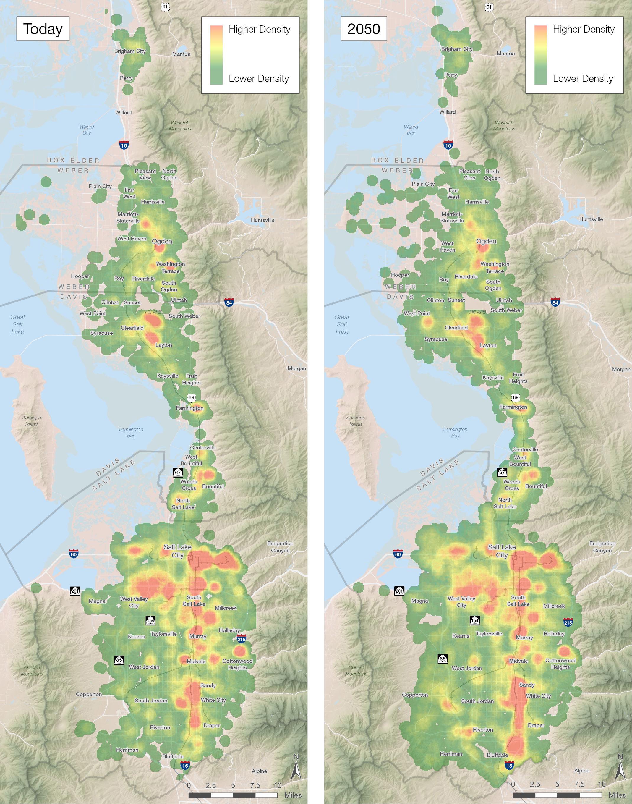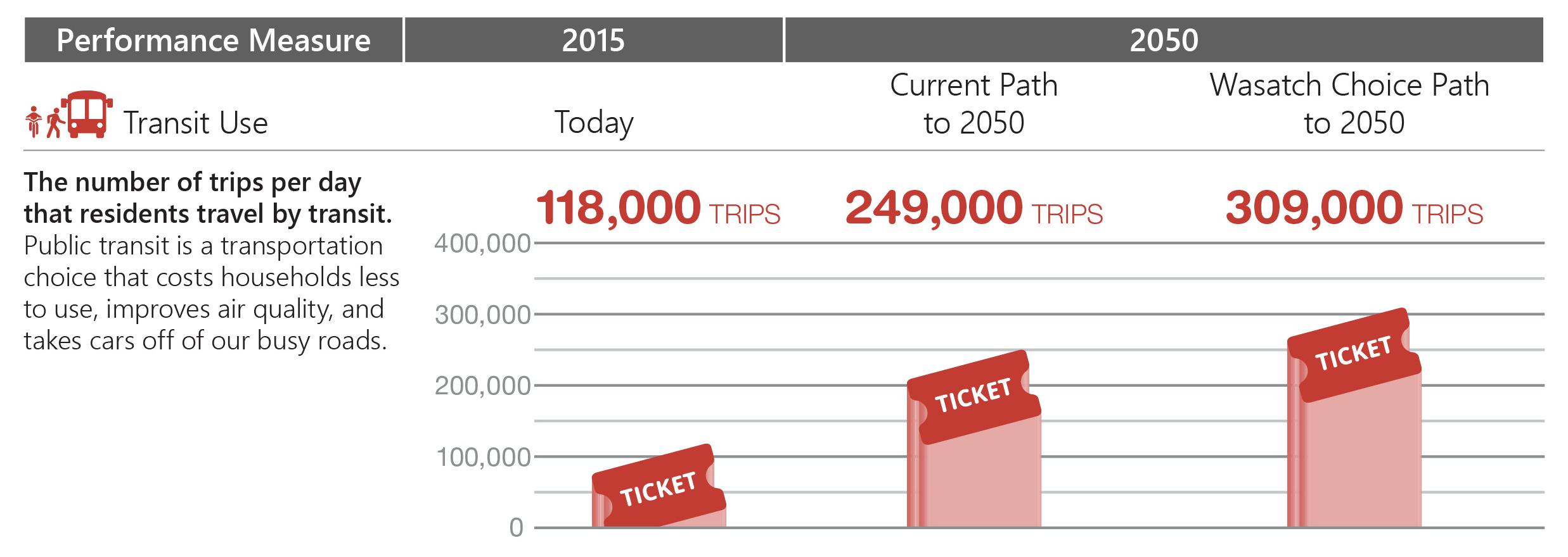 Today, the average resident on the Wasatch Front spends about an hour commuting by car or by transit to and from work each day. Without building planned transportation investments and adopting land use polciies as outlined in the Wasatch Choice 2050, average commute times for the Wasatch Front's growing population are projected to grow to over an hour and forty minutes by the year 2050, as shown in Figure 2. This projection suggests the need to build more road capacity in order to lessen delays; however, investments on roadways alone will not be sufficient. New transportation demands grow as a result of the provision of road capacity. Put another way, many will think: “less congestion means I can drive greater distances now.” This makes efforts to reduce commuting times a vexing challenge.