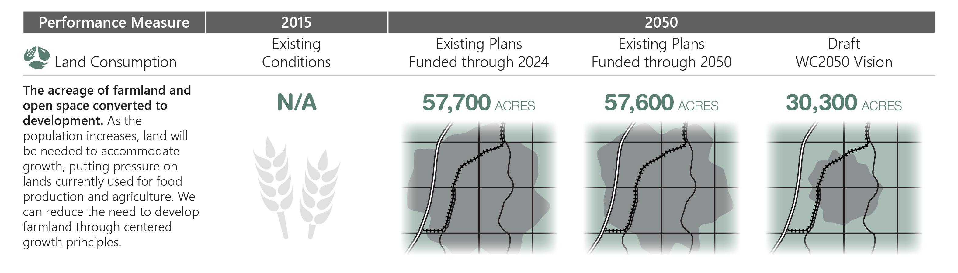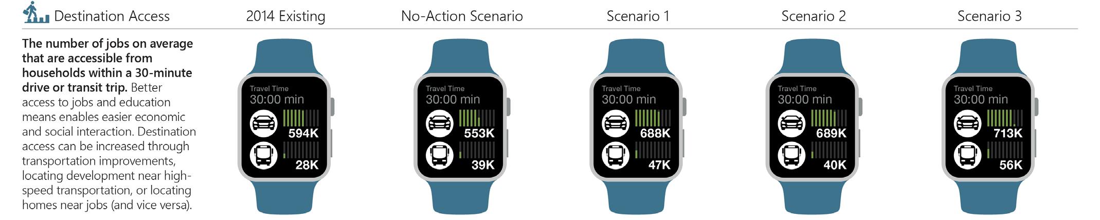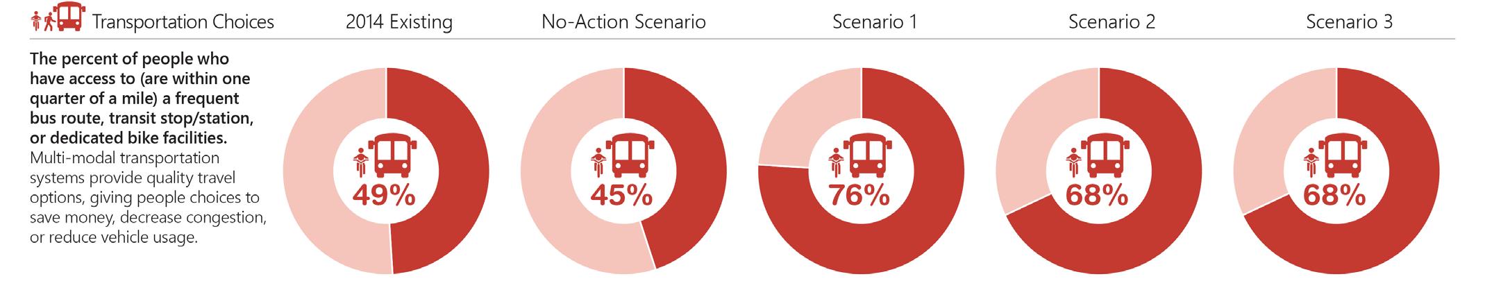 Our Region chose a desired future or vision. Ideas explored in the first stage were packaged into three unique land use and transportation scenarios. The scenarios were used to understand the potential implications of different decisions we might start making today, evaluated against the ten regional goals.