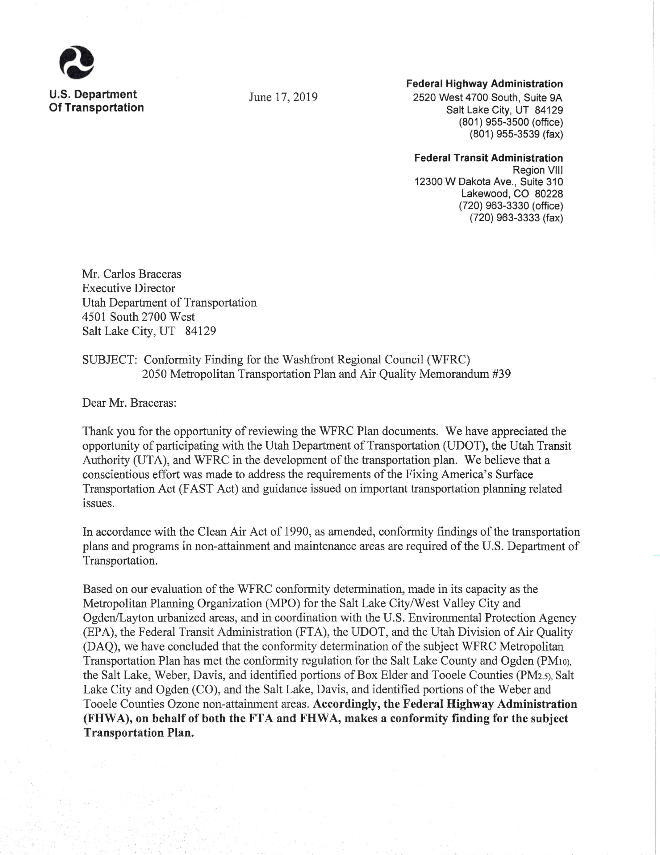 WHEREAS, the Wasatch Front 2019-2050 Regional Transportation Plan addresses the requirements of the Fixing America’s Surface Transportation Act and other applicable federal laws and regulations, and