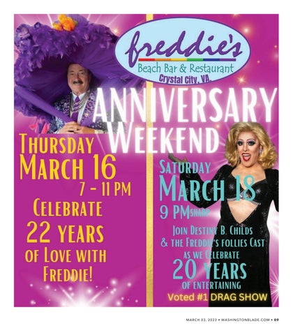 All material in the Washington Blade is protected by federal copyright law and may not be reproduced without the written consent of the Washington Blade. The sexual orientation of advertisers, photographers, writers and cartoonists published herein is neither inferred nor implied. The appearance of names or pictorial representation does not necessarily indicate the sexual orientation of that person or persons. Although the Washington Blade is supported by many fine advertisers, we cannot accept responsibility for claims made by advertisers. Unsolicited editorial material is accepted by the Washington Blade, but the paper cannot take responsibility for its return. The editors reserve the right to accept, reject or edit any submission. A single copy of the Washington Blade is available from authorized distribution points, to any individual within a 50-mile radius of Washington, D.C. Multiple copies are available from the Washington Blade office only. Call for rates. If you are unable to get to a convenient free distribution point, you may receive a 52-week mailed subscription for $195 per year or $5.00 per single issue. Checks or credit card orders can be sent to Phil Rockstroh at prockstroh@ washblade.com. Postmaster: Send address changes to the Washington Blade, PO BOX 53352 Washington, DC 20009. The Washington Blade is published weekly, on Friday, by Brown Naff Pitts Omnimedia, Inc. Rates for businesses/institutions are $450 per year. Periodical postage paid at Washington, D.C., and additional mailing offices. Editorial positions of the Washington Blade are expressed in editorials and in editors’ notes as determined by the paper’s editors. Other opinions are those of the writers and do not necessarily represent the opinion of the Washington Blade or its staff. To submit a letter or commentary: Letters should be fewer than 400 words; commentaries should be fewer than 750 words. Submissions may be edited for content and length, and must include a name, address and phone number for verification. Send submissions by e-mail to knaff@ washblade.com.