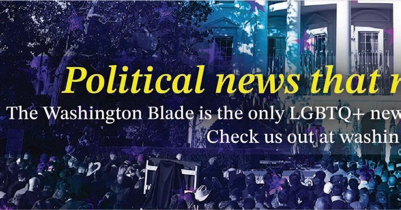 All material in the Washington Blade is protected by federal copyright law and may not be reproduced without the written consent of the Washington Blade. The sexual orientation of advertisers, photographers, writers and cartoonists published herein is neither inferred nor implied. The appearance of names or pictorial representation does not necessarily indicate the sexual orientation of that person or persons. Although the Washington Blade is supported by many fine advertisers, we cannot accept responsibility for claims made by advertisers. Unsolicited editorial material is accepted by the Washington Blade, but the paper cannot take responsibility for its return. The editors reserve the right to accept, reject or edit any submission. A single copy of the Washington Blade is available from authorized distribution points, to any individual within a 50-mile radius of Washington, D.C. Multiple copies are available from the Washington Blade office only. Call for rates. If you are unable to get to a convenient free distribution point, you may receive a 52-week mailed subscription for $195 per year or $5.00 per single issue. Checks or credit card orders can be sent to Phil Rockstroh at prockstroh@ washblade.com. Postmaster: Send address changes to the Washington Blade, PO BOX 53352 Washington, DC 20009. The Washington Blade is published weekly, on Friday, by Brown Naff Pitts Omnimedia, Inc. Rates for businesses/institutions are $450 per year. Periodical postage paid at Washington, D.C., and additional mailing offices. Editorial positions of the Washington Blade are expressed in editorials and in editors’ notes as determined by the paper’s editors. Other opinions are those of the writers and do not necessarily represent the opinion of the Washington Blade or its staff. To submit a letter or commentary: Letters should be fewer than 400 words; commentaries should be fewer than 750 words. Submissions may be edited for content and length, and must include a name, address and phone number for verification. Send submissions by e-mail to knaff@ washblade.com.