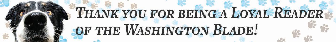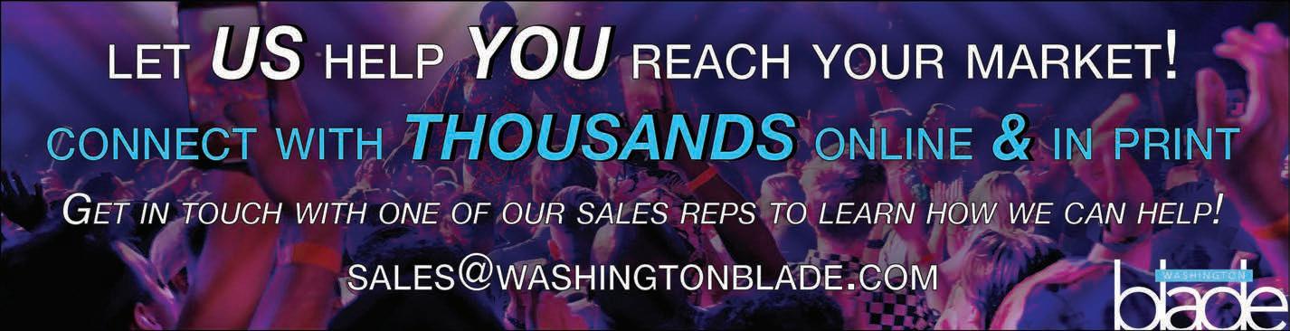All material in the Washington Blade is protected by federal copyright law and may not be reproduced without the written consent of the Washington Blade. The sexual orientation of advertisers, photographers, writers and cartoonists published herein is neither inferred nor implied. The appearance of names or pictorial representation does not necessarily indicate the sexual orientation of that person or persons. Although the Washington Blade is supported by many fine advertisers, we cannot accept responsibility for claims made by advertisers. Unsolicited editorial material is accepted by the Washington Blade, but the paper cannot take responsibility for its return. The editors reserve the right to accept, reject or edit any submission. A single copy of the Washington Blade is available from authorized distribution points, to any individual within a 50-mile radius of Washington, D.C. Multiple copies are available from the Washington Blade office only. Call for rates. If you are unable to get to a convenient free distribution point, you may receive a 52-week mailed subscription for $195 per year or $5.00 per single issue. Checks or credit card orders can be sent to Phil Rockstroh at prockstroh@ washblade.com. Postmaster: Send address changes to the Washington Blade, PO BOX 53352 Washington, DC 20009. The Washington Blade is published weekly, on Friday, by Brown Naff Pitts Omnimedia, Inc. Rates for businesses/institutions are $450 per year. Periodical postage paid at Washington, D.C., and additional mailing offices. Editorial positions of the Washington Blade are expressed in editorials and in editors’ notes as determined by the paper’s editors. Other opinions are those of the writers and do not necessarily represent the opinion of the Washington Blade or its staff. To submit a letter or commentary: Letters should be fewer than 400 words; commentaries should be fewer than 750 words. Submissions may be edited for content and length, and must include a name, address and phone number for verification. Send submissions by e-mail to knaff@ washblade.com.