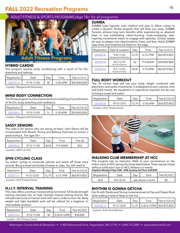 FALL 2022 Recreation Programs 18 Washington County Parks & Recreation • 11400 Robinwood Drive, Hagerstown, MD 21742 • (240) 313-2805 • www.washcorecfit.com