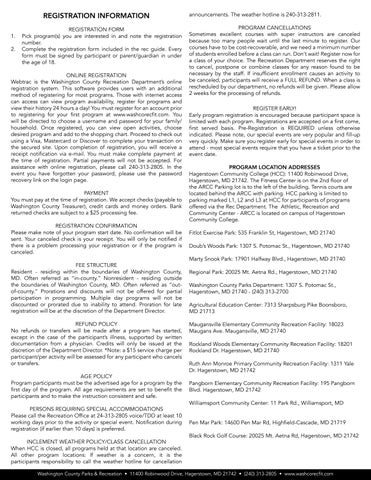 Resident - residing within the boundaries of Washington County, MD. Often referred as “in-county.” Nonresident - residing outside the boundaries of Washington County, MD. Often referred as “outof-county.” Prorations and discounts will not be offered for partial participation in programming. Multiple day programs will not be discounted or prorated due to inability to attend. Proration for late registration will be at the discretion of the Department Director.