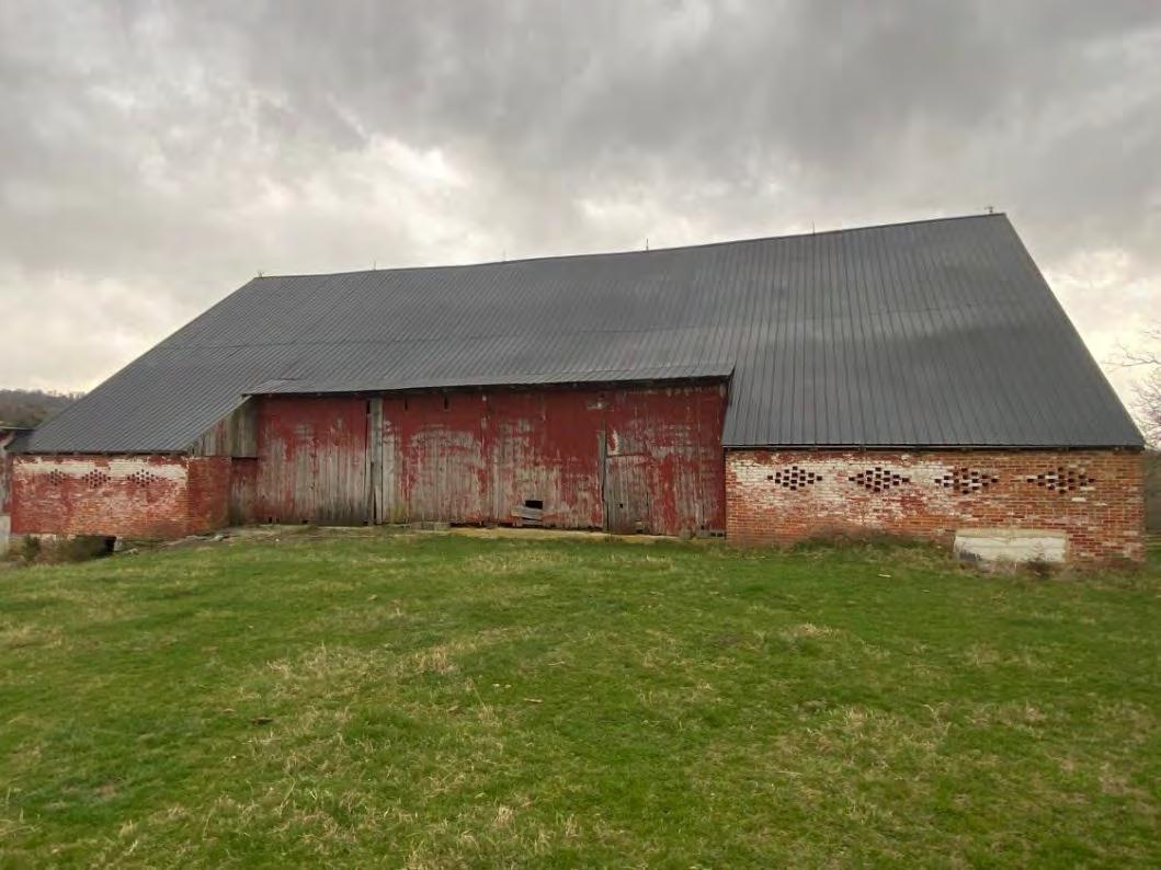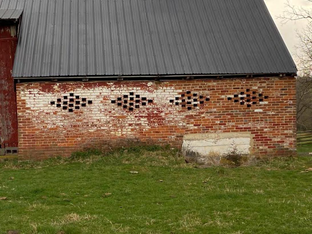 Principal exterior materials of the property: Foundation-Stone; Dwelling Walls-Brick, Barn Walls-Brick and Wood; Porches-Wood