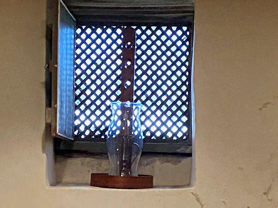 The symmetrical fenestration of the façade includes four six-over-six, double-hung sash windows on the first story, two on each side of the central entrance, and five six-over-six, double-hung sash windows on the second story. The first-story window openings have extended brick jack arches above them, with smaller brick jack arches above the second-story window openings. All windows are framed with original wooden shutters, held back with replica shutter dogs copied from an original found on site. Piercing the raised basement are four original, square ventilation windows aligned with the first-floor windows.