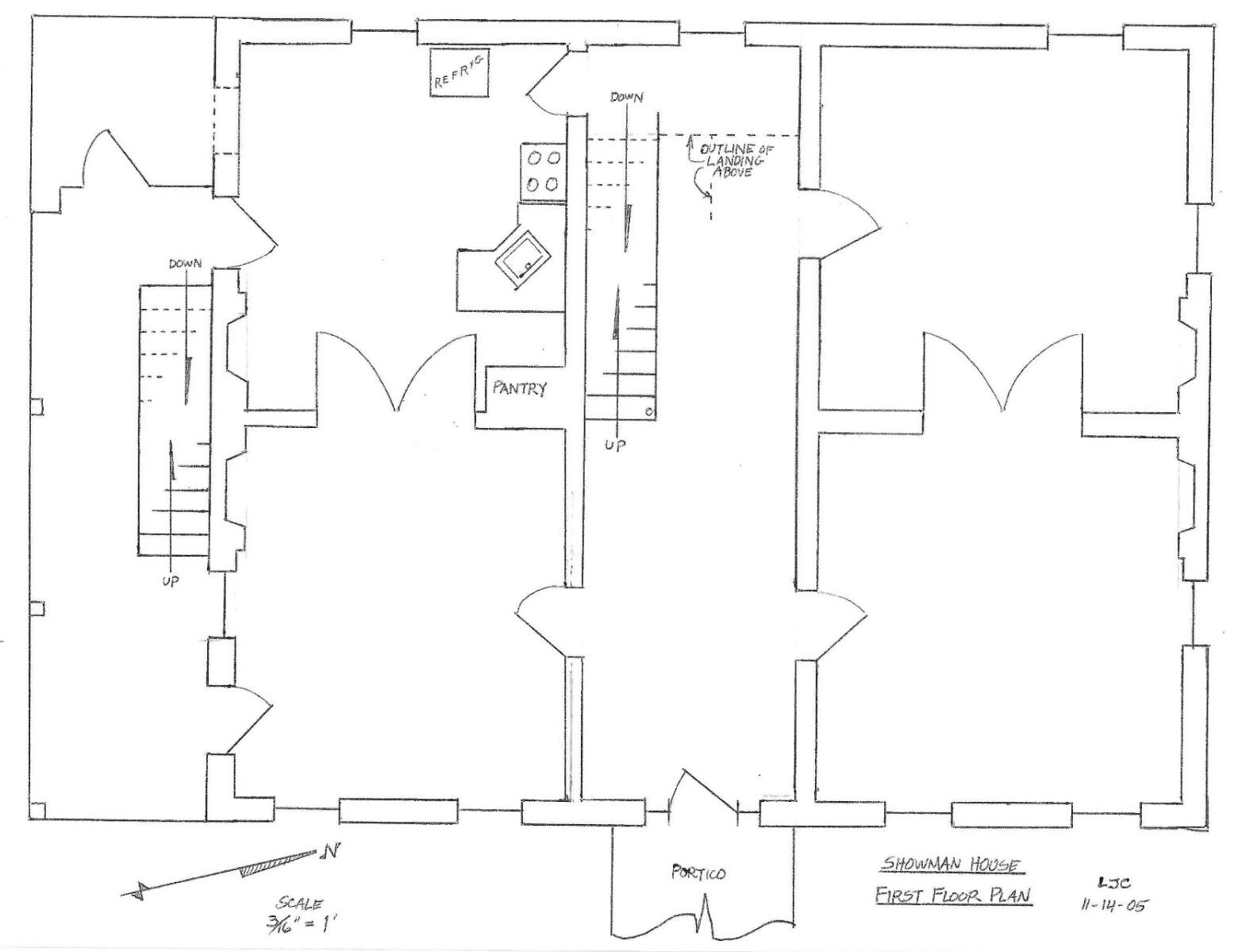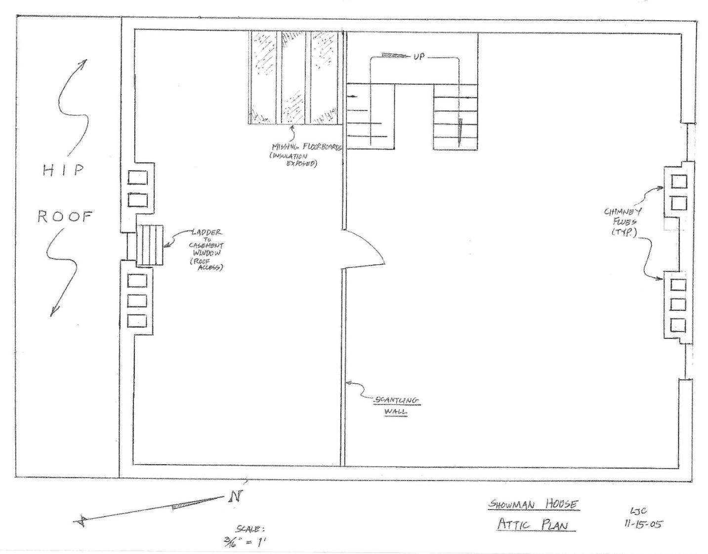 The dwelling’s north elevation has paired interior end chimneys with common bond brickwork. There are six symmetrical window openings. The first story has two six-over-six, double-hung sash windows with jack arches and original wooden louvered shutters with shutter dogs on either side of the chimneys. On the second story, two six-over-six, double-hung sash windows with jack arches and original wooden louvered shutters with shutter dogs are directly above the firststory windows. Two single six-pane windows with brick jack arches are placed above the firstand second-story windows in the gable. The raised stone foundation is revealed to a fuller extent as the ground level falls away towards the back of the structure. One six-over-six, double-hung sash window with wooden paneled shutters pierces the stone foundation, aligned with the windows to the right of the chimneys.