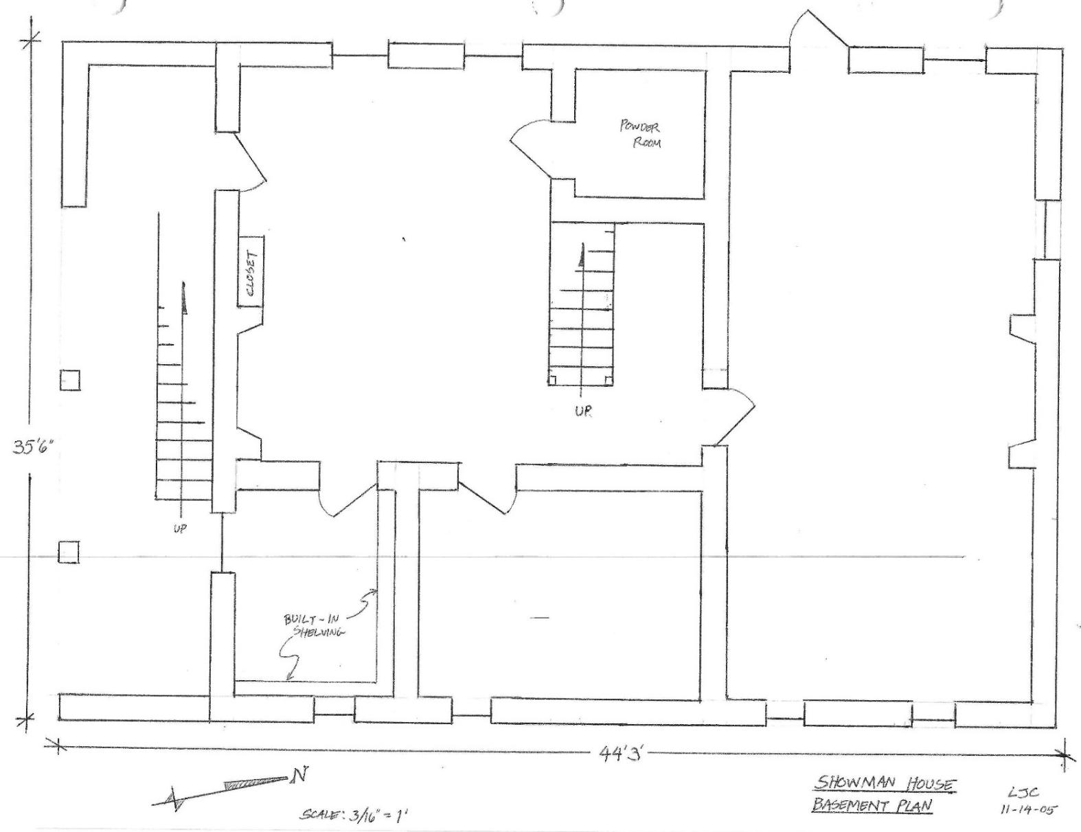 The west elevation (rear) reveals the full two-and-a-half-story height of the house, with the stone foundation and basement fully exposed. The common bond brickwork continues, and the rear cornice mirrors the corbelling and brick dentils on the façade. Six asymmetrically placed window openings are set in a three-bay configuration. The exposed basement has four openings (window, door, window, window). The first and fourth bays are vertically aligned with the windows above them; all are six-over-six, double-hung sash windows with paneled shutters. The door into the basement area is board and batten with sizeable wrought iron strap hinges. The first floor has three six-over-six double-hung sash windows with paneled shutters on the first and third