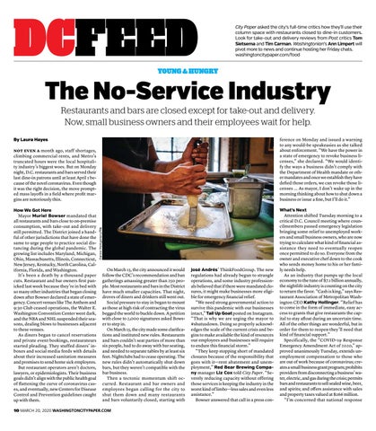 José Andrés’ ThinkFoodGroup. The new regulations had already begun to strangle operations, and some industry professionals believed that if there were mandated closures, it might make businesses more eligible for emergency financial relief. “We need strong governmental action to survive this pandemic with our businesses intact,” Tail Up Goat posted on Instagram. “That is why we are urging the mayor to #shutusdown. Doing so properly acknowledges the scale of the current crisis and begins to make available the kind of resources our employees and businesses will require to endure this financial storm.” “They keep stopping short of mandated closures because of the responsibility that goes with it—rent abatement and unemployment,” Red Bear Brewing Company manager Liz Cox told City Paper. “Severely reducing capacity without offering those services is keeping the industry in the worst kind of limbo—less sales and even less assistance.” Bowser answered that call in a press con-