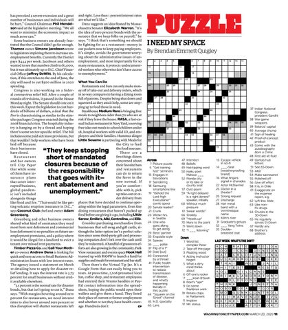 has provoked a severe recession and a great number of businesses and individuals will be hurt,� Council Chairman Phil Mendelson said at the legislative meeting. “We all want to minimize the economic impact as much as we can.� Some business owners are already frustrated that the Council didn’t go far enough. Thamee owner Simone Jacobson wrote to legislators imploring them to increase unemployment benefits. Currently the District pays $444 per week. Jacobson and others wanted to see that number climb to $1,000, but it was ultimately up to D.C. Chief Financial Officer Jeffrey DeWitt. By his calculation, if this stretches to the end of June, the city will need to cut $500 million in 2020 spending. Congress is also working on a federal coronavirus relief bill. After a couple of rounds of revisions, it passed in the House Monday night. The Senate should vote on it this week. Expect the legislation to cost hundreds of billions of dollars, a deal that the Post is characterizing as similar to the stimulus packages Congress enacted during the 2008 financial crisis. The hospitality industry is hanging on by a thread and hoping there’s some sector-specific relief. The bill includes some paid sick leave provisions, but that wouldn’t help workers who have been laid off because their businesses have closed. Restaurant and bar owners tell City Paper that while some of them have ins u ra n c e p la n s that cover interrupted business, global pandemic isn’t included alongside things like flood and fire. “That would be like getting volcanic eruption insurance in D.C.,� says Coconut Club chef and owner Adam Greenberg. Greenberg and other business owners shared what kind of assistance they need most from rent deferment and commercial loan deferment to no penalties on future unemployment premiums, and a policy where it would be illegal for a landlord to evict a tenant over missed rent payments. Timber Pizza Co. and Call Your Mother co-owner Andrew Dana is looking for quick and easy access to Small Business Administration loans with low interest rates. The agency issued a statement on March 12 detailing how to apply for disaster relief lending. It says the interest rate is 3.75 percent for small businesses without credit available elsewhere. “3.5 percent is the normal rate for disaster bonds, but that isn’t going to cut it,� Dana says. “With margins hovering around zero percent for restaurants, we need interest rates to also hover around zero percent or this disruption will shutter restaurants left