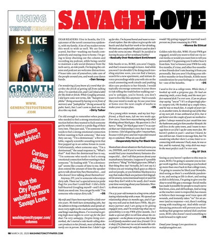 would? My getting engaged (or married) won’t prevent me from remaining his FWB. —Wanna Be Ethical Golden rule this shit, WBE: If your FWB got engaged, would you want to find out via social media or would you want him to tell you personally? I’m guessing you’d rather hear it from him. You’ve known your FWB for only five months, it’s true, and other five-monthsor-less friends don’t rate hearing it from you personally. But you aren’t fucking your other five-months-or-less friends. A little more consideration for your feelings is—or should be—one of the benefits. —DS I used to live in a college town. While there, I hooked up with a gorgeous guy. He had an amazing smile, a nice body, and the most perfect natural dick I’ve ever seen. (Can we please stop saying “uncut”? It’s so disgustingly plastic surgery-ish.) We hooked up a couple times, and he was so much fun. A couple of years later, in another town, he showed up out of the blue at my new job. It was awkward at first, but it got better over the couple of years we worked together. I always wanted to just sneak him into the bathroom and give him another blowjob. He still lives in the same town, and I want to message him to see if he’s up for some more fun. We haven’t spoken in years—and last I heard, he was still not out. I want to message him, but I’m wondering whether there’s a time limit to reconnecting with someone? Fuck, man, he was so hot, and his natural, big, veiny dick was maybe the most perfect cock I’ve ever seen. —Big Ol’ Dick Seeing as you haven’t spoken to this man in years, BOD, I’m going to assume you no longer work together. And seeing as you hooked up more than once back in that college town, I’m going to assume he liked your blowjobs. And seeing as there’s a worldwide pandemic on, and seeing as life is short, and seeing as dick is delicious, I’m going to give you the okay to send this guy a message. Social media has made it possible for people to reach out to first loves, exes, and old hookups. And so long as the reacher-outer is respectful, has reason to believe their message won’t tear open old wounds, and instantly takes “no” for an answer (and no response = no), there’s nothing wrong with reaching out. And while socialdistancing protocols will prevent you from sucking that gorgeous natural dick anytime soon, BOD, who doesn’t need something to look forward to right now? —DS Email your Savage Love questions to mail@savagelove.net.