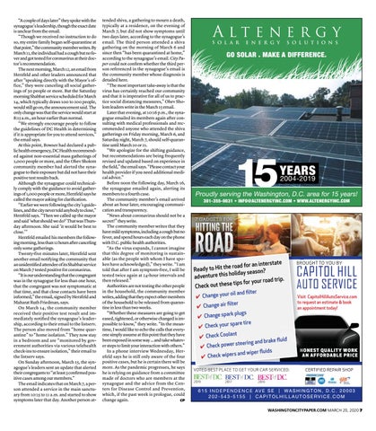 tended shiva, a gathering to mourn a death, typically at a residence, on the evening of March 7, but did not show symptoms until two days later, according to the synagogue’s email. The third person attended a shiva gathering on the morning of March 6 and since then “has been quarantined at home,” according to the synagogue’s email. City Paper could not confirm whether the third person referenced in the synagogue’s email is the community member whose diagnosis is detailed here. “The most important take-away is that the virus has certainly reached our community and that it is imperative for all of us to practice social distancing measures,” Ohev Sholom leaders write in the March 15 email. Later that evening, at 10:16 p.m., the synagogue emailed its members again after consulting with medical professionals and recommended anyone who attended the shiva gatherings on Friday morning, March 6, and Saturday night, March 7, should self-quarantine until March 20 or 21. “We apologize for the shifting guidance, but recommendations are being frequently revised and updated based on experience in the field,” the email says. “Please contact your health provider if you need additional medical advice.” Before noon the following day, March 16, the synagogue emailed again, alerting its members to a fourth case. The community member’s email arrived about an hour later, encouraging communication and transparency. “News about coronavirus should not be a secret!” they write. The community member writes that they have mild symptoms, including a cough but no fever, and spend hours each day on the phone with D.C. public health authorities. “As the virus expands, I cannot imagine that this degree of monitoring is sustainable (as the people with whom I have spoken have acknowledged),” they write. “I am told that after I am symptom-free, I will be tested twice again at 24-hour intervals and then released.” Authorities are not testing the other people in the household, the community member writes, adding that they expect other members of the household to be released from quarantine in less than two weeks. “Whether these measures are going to get eased, tightened, or otherwise changed is impossible to know,” they write. “In the meantime, I would like to echo the calls that everyone simply assume at this point that they have been exposed in some way … and take whatever steps to limit your interaction with others.” In a phone interview Wednesday, Herzfeld says he is still only aware of the four positive cases, but he is certain there will be more. As the pandemic progresses, he says he is relying on guidance from a committee made of doctors who are members at the synagogue and the advice from the Centers for Disease Control and Prevention, which, if the past week is prologue, could change again. CP