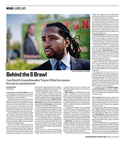 Village, the company that runs the facility announced it would not seek renewal of its contract with BOP, which expires April 30. Varone, Hope Village’s chief executive, did not respond to a phone call seeking comment, but he told the Washington Post that a recent lawsuit alleging a lack of medical care and testing for the facility’s residents cost the company “unnecessary time and attorney’s fees” and that some men could head back to prison. The facility also employed more than 50 Ward 8 residents, the Post reported. Stuart Anderson, White’s third challenger, who served more than a decade in prison and lived in Hope Village in 2008, says “I do the work. Social media? Posting? I don’t need that.” White did not agree to an interview and did not respond to written questions by press time. Others believe White’s Instagramming and Facebooking show a level of authenticity that’s rare among elected officials. At-Large Councilmember Elissa Silverman, who is supporting White and donated to his campaign, calls his Instagram feed “must-watch TV” and says his service-heavy approach to the job is necessary for one of the most economically depressed areas of the District. “He has a different job than almost any other member,” Silverman says. “The need for services is so great in Ward 8, and the level of violence is higher than any other ward. So he’s directly responding to crime scenes, and oftentimes he knows either the victim or sometimes the suspect.” During his first four years on the D.C. Council, White’s unconventional approach to the job has made him more than a few enemies. Ten people originally filed to dethrone Trayon “Ward Eight” White, as his name appears on the ballot, and there is growing frustration over what critics say is White’s hostility and unwillingness to work with those who disagree with him. The question is, will it matter? “I consider him Ward 8’s Donald Trump,” says Darrell Gaston, an advisory neighborhood commissioner who is supporting Austin. “No matter what he does, his supporters feel he can do no wrong.” The campaign is heating up, Austin tells LL at the beginning of a phone interview. Last week, a hooded man busted the window of Austin’s Mustang while it was parked in front of his house. Austin believes it was a campaignrelated scare tactic. On the same day, White posted on Instagram that a neighbor called to say someone was taking his campaign signs down. “Then I see all these Mike Austin signs up,” White wrote. “So who do I see, Ole Lenwood walking around with signs in his hand. The hate is going to bring more love.” White asked his supporters to post pics tagged with #ImWithTray, and the comments came flooding in. Austin brands himself as a more experienced, mild mannered alternative to White. The chair of Advisory Neighborhood Commission 8C is unimpressed with the legislation the incumbent introduced in his first term and says White’s abrasiveness toward people who challenge his ideas has ostracized certain people in the ward.
