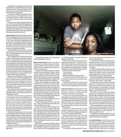 Currently, she’s reading a book about medieval Swedish history in which the black plague is a topic of discussion. That “really puts it in perspective,” she says. She recently finished War and Peace, which she calls “an experience.” As an introvert, she likes spending time alone, but now, she says, she’s forgotten how to interact with other humans. “When they do contact me, I’m like wait how do you have a conversation again?” One of the worst aspects of the pandemic, she says, is “the way it’s revealed all the inequalities of the system. I wish there was more I could do. But at some point I have to tear myself away from upsetting media about things that are entirely beyond my control because it just makes me so upset that it’s hard to go about life and do work.” Kelis Corley of Capitol Heights, laments that her final high school semester will end without any of the celebration that usually comes with it. The 17-year-old St. John’s College High School senior plans to attend Stony Brook University in New York on a basketball scholarship in the fall. Her high school basketball season concluded before the coronavirus-related closures, but nearly everything else has changed. “We already did most of our work on an online system, but now we get so much more work,” she says. “It’s a little bit harder because you’re not having a whole lesson there.” Time management for school work has been tough—it’s hard to stay focused at home when she can turn on her television at any time. At school, there are no at-home distractions, and the teacher is always right there to lend help when it’s needed. If she needs help now, Corley says, she has to email her teacher and wait for a response. At one point, the sound wasn’t working during one of her online sessions. Her teacher was teaching, but couldn’t be heard by students. They’ve since figured out the technological woes, she says, but the handson aspects of learning are still absent. The decrease in her ability to socialize in person has been a particularly challenging adjustment. “You don’t get to see anybody,” she says. “Your senior year, you’re going to want to have fun. We can’t have prom or graduation anymore, so it’s really sad for our class. We’re missing a lot of experiences that everybody looks forward to when they’re growing up.” She and her classmates and teachers are used to seeing each other every day. She’s realized how instrumental they are in her life now that they’re physically gone from it. Her days are slow. She wakes up just before having to go to virtual class from about 9:30 a.m. until about 2:30 p.m. She also tries to get workouts in to stay fit. Her college basketball team’s summer workouts, where she’d get to know her new teammates, have been canceled. She cooks more now, too. Her mom gets the groceries. Corley has asthma, and her mother doesn’t think she should be potentially putting herself at risk by going out. With physical classes and activities canceled, her senior group is filled with anger and sadness for what feels like their lost and incomplete year. “We’ve worked our whole lives to get to this point to graduate,” she says. “Everybody’s just really mad at the world. Everybody’s posting memories of school because who would have thought that we couldn’t finish school.” But there is one thing Corley can be happy and proud about: There are only a few weeks left of high school.