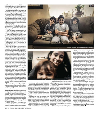 and Zander, who’s 6 months old. Lai’s stepson Ian, 15, is with them every other week, alternating between their Mount Pleasant home and his mother’s place nearby. Lai says Zander is “a healthy, fast-growing, big chunker of a boy.” He wakes up in the wee hours of the morning for feedings, and Zoey wakes up between 6 and 7 a.m., calling for Yoon. “I love being crafty, and Zoey is a little bit too,” she says. “So we try to do activities, from pouring colored water from one container to another to finger painting. Many, many days, we are putting on Moana or a lot of iPad time, especially if Howard and I have calls or important documents or meetings to get out.” Zoey is luckily still taking naps; she might start napping as early as 12:30 p.m. or as late as 3 p.m. The pair have adjusted all of their calls to be taken in the “nap zone.” “Every day feels like such a marathon,” she says. She can’t reliably work on anything. She’s had to use feeding time to her advantage. “When Zander was getting up twice a night, there’s something biological that gets you,” she says. “My eyes would fly open the moment I heard him stirring. I would go and give him a bottle and then I would be like, ‘I have a million things to do: I have to apply for my PPP loan, I have to apply for the D.C. microgrants.’ I’m going to do it between 2 and 4 a.m. because I can’t do it after 9 a.m.” After about five weeks of not having the full attention of her teachers or playtime with her peers, Zoey can be more clingy now, Lai says. It’s been tough to have a serious call while she’s awake and nearby. Lai can do all of her checkin calls with Zander snuggled in her lap, but she recalls one incident that he interrupted. “I was leading a conference call with my team, and I looked down and he was so quiet for a long time, and I saw he had this big poopy diaper blowout and I was like ‘I gotta go guys!’ It was just one of those mom moments that I think I’m not alone in, juggling the disaster that can be functioning as a 100 percent parent and 100 percent business owner and working person at the same time.” Lai says she hasn’t had a chance to be bored or depressed because she’s been kept busy. Everything she does, from sitting down to play LEGOs with Zoey for 45 minutes to staying up in the middle of the night to apply for loans, she’s doing for her children and her employees. As wild as the current situation is, there are nice moments. Lai enjoys making her kids laugh, spending time with her husband, and taking 5 p.m. pre-dinner walks that might not otherwise be happening if they were running around meeting clients and reporters. “So what that I may never see Tiger King? That is not even something that occurs to me,” she says. “I self-medicate with chocolate, like a lot of chocolate. And we get by.” Julia Saladino and her husband juggle time working and parenting their nearly 19-monthold daughter, Adelina, at home. Saladino is a nonprofit attorney who runs a legal email hotline, and her husband is a therapist. They’ve both been working from home since mid-March, and have decided that as long as they are home, they’ll be there with their daughter regardless of her daycare’s status. “Outside of our parental leave, I don’t think it’s ever been like this extended amount of time that we’re all hanging out at the house,” she says.