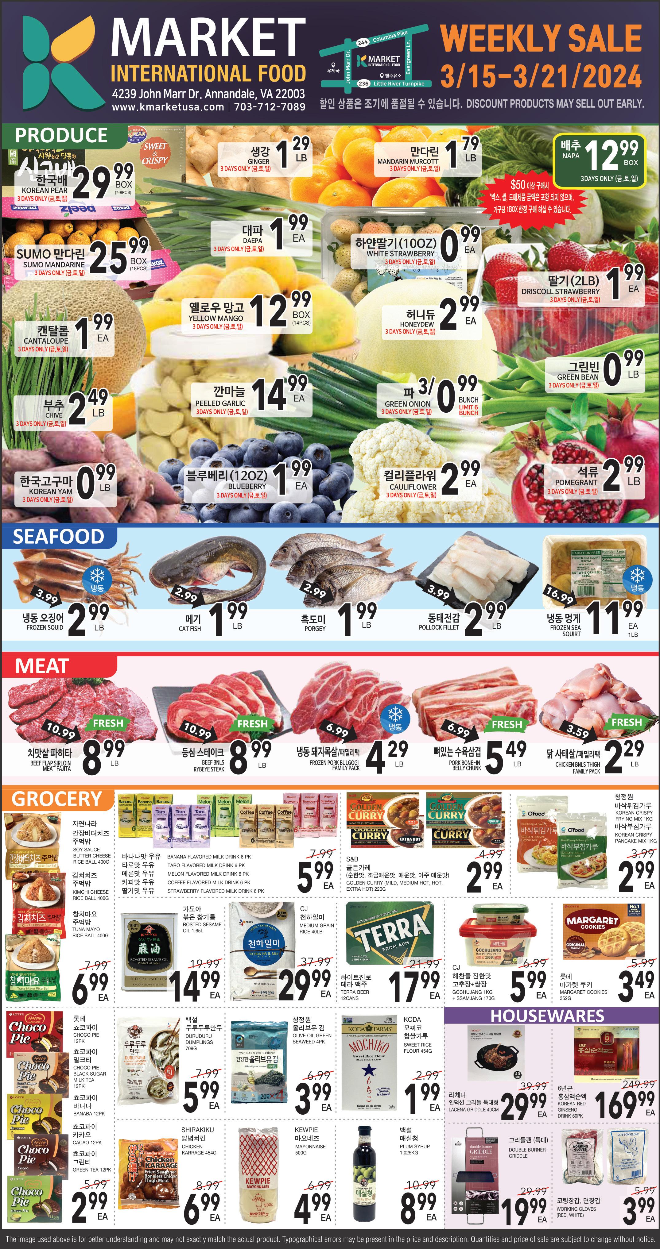 월,수,금: 8:45-12:00PM 50년 경력 배송전문 Tel. 703-298-1919 7000 Newington Rd, suite H, Lorton VA 22079 www.vapumyang.com/va@pumyang. com/vapumyang@gmail.com