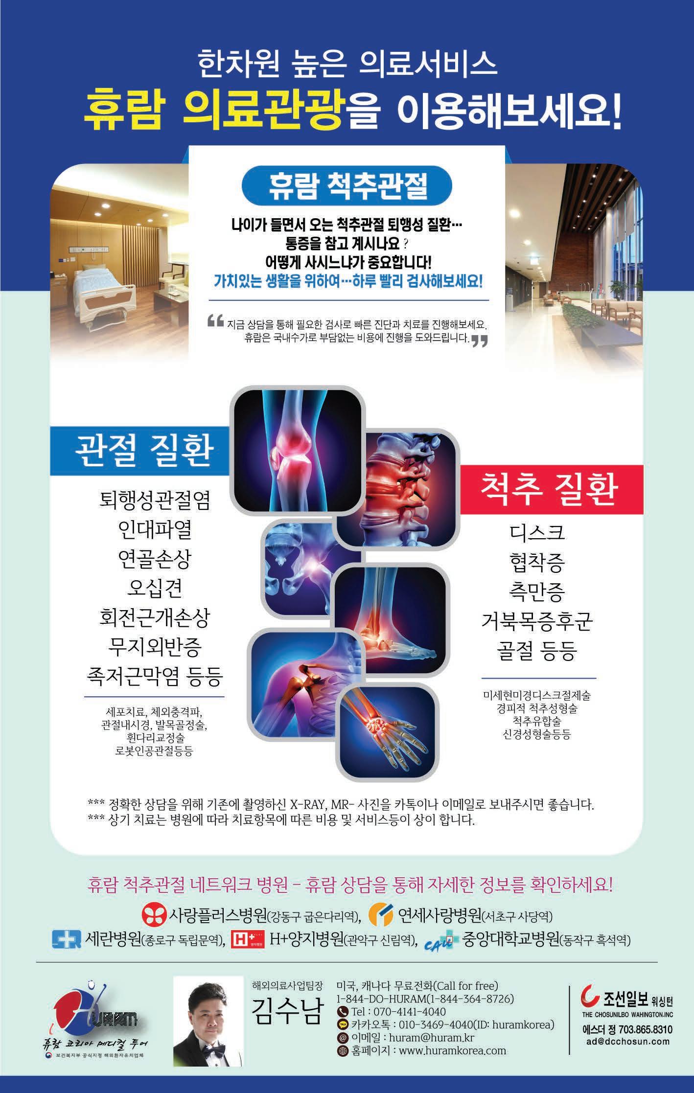 등 더 큰 병으로 발전 하기도 한다. 또한, 경제적으로 부담스러운 치료비 걱 정이 앞서는 환자들에게 꼭 복음 한의원 에 내원해서 지긋지긋한 고통에서 벗어나 길 바란다는 이영인 원장과 김영준 부원장 에게 박수를 보낸다. ▷주소: 13301 Kara Ln, Silver Spring, MD 20904 ▷전화: 202-681-6881/ 301814-2332 ▷이메일: bokeumacu@gmail. com 이선아 기자