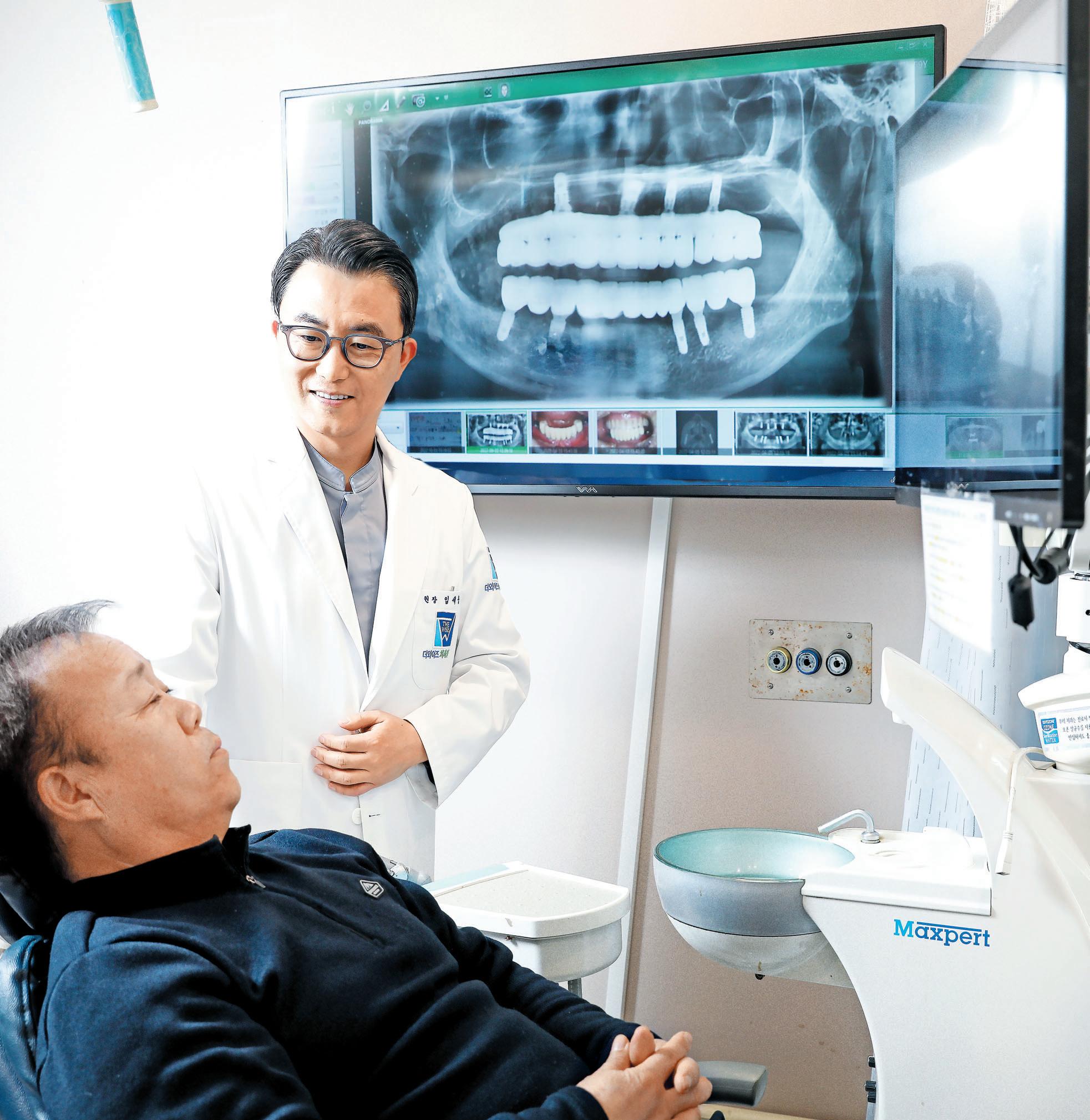 임원장은과거틀니를오랫동안착용한고령의환자로부터“틀니에서벗 어났으면좋겠다”는말을듣고반드시씹는즐거움을느낄수있게해주겠다 고다짐했다. 고령의환자대부분은임플란트가불가능하다는진단을받거나 치료에대한두려움때문에치과진료를미루는경우가많다. 임원장은“올 온엑스치료를시행한결과, 4개의임플란트고정만으로아래쪽전체치아가 회복되는것을확인했다”며“치료기간이짧고과정도간단해수술부담감이 적어연령과관계없이누구나치료를받을수있다”고말했다. 일반틀니를편하게착용하는이도적지않지만틀니가눌려잇몸통증이 발생하는등불편함을호소하는사례가더많은게현실이다. 임원장은이 들에게합리적인치료법을소개해부담을덜어주는게목표다. 그는“실제 잇몸뼈가없어서임플란트가어려운환자, 비용부담으로치료를망설였던 환자모두의치료를도왔다”며“덕분에이들모두정기적인검진을통해건 강한구강상태를유지중이며, 지금도환자를위한여러치료법을연구중”이 라고말했다.