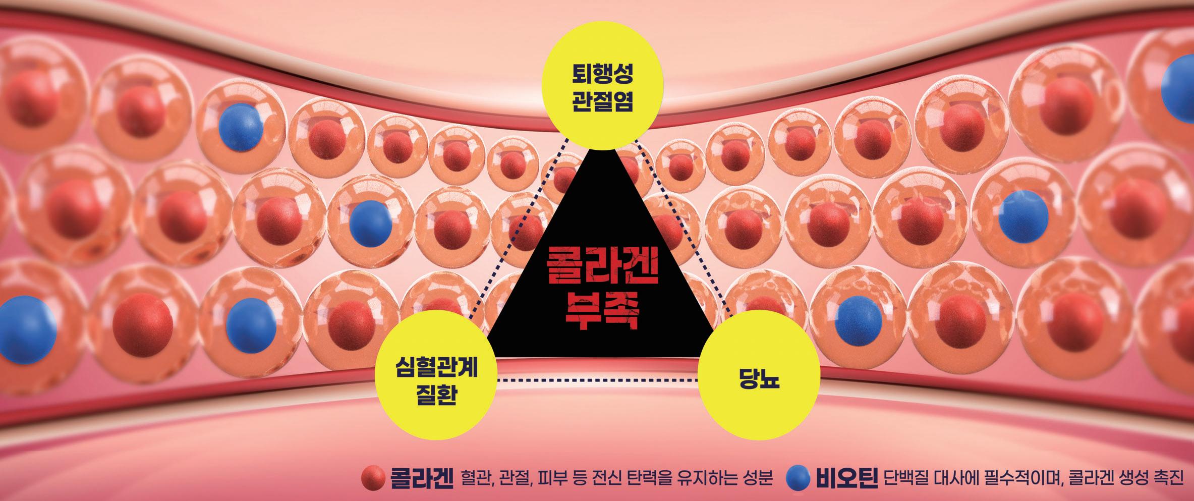 화로혈관탄력이떨어지면혈관이딱딱해진다. 이상태서기온이낮아져혈관이수축하면높아 지는혈압을혈관이감당하지못한다. 고혈압이 없다가도생기기쉽다. 혈관상태가악화하면혈 관에난상처가잘회복되지않는다. 상처부위에 콜레스테롤이나중성지방이달라붙으면, 혈관이 단단해져동맥경화증이나심₩뇌혈관계질환이생 길가능성이커진다. 심₩뇌혈관질환예방은혈관관리에서시작된 다. 혈관구성성분인콜라겐을보충하는것이좋 은이유다.
