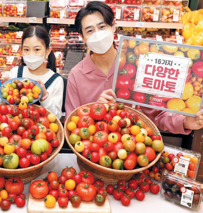 B32022년 11월 3일 목요일 The Chosun DailyLife 조선일보2022년10월24일월요일 C3 감홍사과₩짭짤이토마토‐이색제철과일, 여기다있네 이마트는10월사과철을맞아‘사과피크’행사를열고 프리미엄햇사과3개품종을저렴한가격에판매한다. 행사 상품은‘양광사과’,‘시나노골드’,‘감홍사과’3종이다. 양광사과는아삭한식감과새콤달콤한맛을느낄수있는 품종이다. 사과의유명산지인경북영주, 문경, 안동등에 서수확한다. 시나노골드는노란빛이나는사과로일명 금사과’라고불린다. 주로경북청송에서수확하며풍부한 단맛과적당한새콤함이특징이다. 감홍사과는국내에서개발한신품종이다. 문경에서만재 배하는프리미엄사과다. 표면이다소거칠지만진한붉은 색을띄며높은당도와아삭한식감을자랑한다. 이마트는10월에2~3주정도출하되는프리 미엄햇사과3종을합리적인가격에고객들 이맛볼수있도록1년전부터행사를기획 했다. 지난해프리미엄사과매출이전년 보다약2배이상늘어난것을확인하고, 구색상품으로소량운영하던프리미 엄사과물량을약50%가까이추가 확보해이번행사를준비했다. 이마트는지난 2020년부터‘품종 다양화’라는테마로딸기약10여 종, 토마토16종등평소접하기어려운이색품종을소개하 고있다. 지난4월에진행한‘토마토뮤지엄’행사에서는 총16종에달하는다양한품종의토마토를선보여소비자 들의큰호응을얻었다. 대표상품으로는‘무지개방울토 마토’,‘더달콤스테비아대추방울토마토’,‘프리미엄짭 짤이토마토’등이다. 올해는고객선호도가높은‘스테비아토마토’를3종으 로확대해선보였다. 스테비아토마토는천연감미료이자