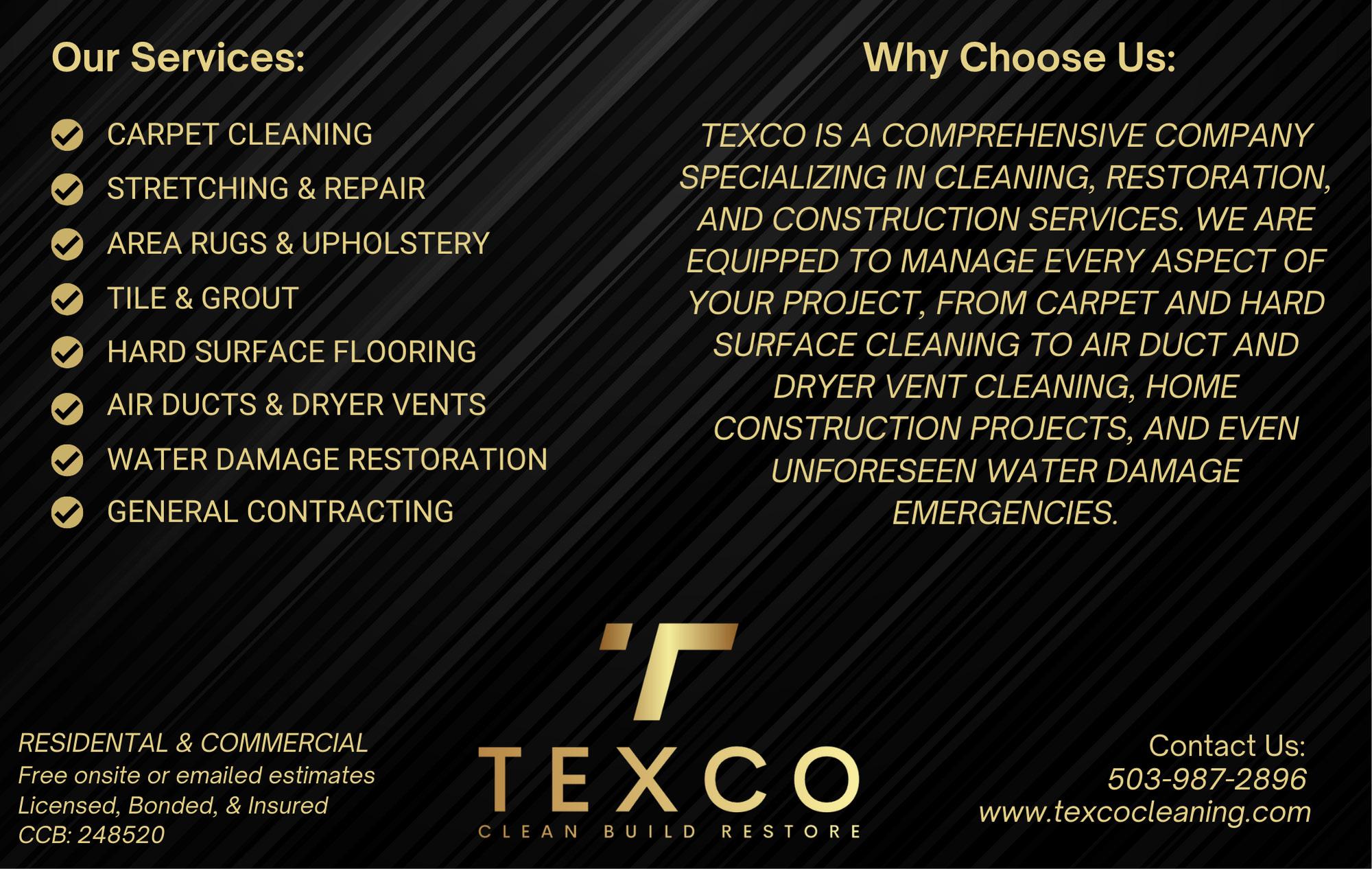 TexCo Cleaning Scappoose, OR (503) 987-2896 texcocleaning.com CARPET, RUG & UPHOLSTERY CLEANERS