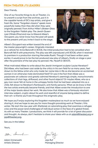 One of our favorite things to do at Theater J is to unearth a script from the archives, put it in the capable hands of DC’s top artists, and give it fresh life. Some “forgotten classics” speak more powerfully today than they did when they were originally penned. From Arthur Miller’s Broken Glass to the forgotten Yiddish play The Jewish Queen Lear (Mirele Efros) and now to Edward Albee’s Occupant, you never know how the past will speak to the present until you invite it back to the stage. Albee’s Occupant was written toward the end of the master playwright’s career. Originally intended as a vehicle for Anne Bancroft in 2002, the initial production had to be cancelled when Bancroft fell ill with pneumonia. The play was left unproduced until 2008, when it received its premiere in a production starring Mercedes Ruehl. Though it had been written years earlier, it would prove to be the last produced new play of Albee’s, finally on stage a year after the premiere of the last play he penned: Me, Myself & I (2007). What motivated Albee to write about the Jewish immigrant sculptor Louise Nevelson? Did Albee, who had been cast aside by the critics in his own field for so many years, feel drawn to this fellow artist who only made her name late in life as she became an acclaimed woman in an otherwise male-dominated field? Or was it the fact that Albee was a passionate art collector and greatly admired Nevelson’s seemingly simple, monochromatic collections of chair legs, driftwood, and other found objects? Or maybe Albee, who as a gay man never felt at home in the unhappy family that he had been adopted into as a child, felt drawn to Nevelson’s flamboyant, anti-family persona. What we do know is that the two artists eventually became friends, and that Albee wrote the introduction to one of the major books about her work. We also know that Albee was a famously reluctant interview subject, cryptic about his work and resentful of anyone being asked to define their art—a theme you’ll see throughout this enigmatic play. We hope you’ll enjoy exploring this forgotten masterpiece as much as we have enjoyed sharing it. And we hope to see you for more thought-provoking work at Theater J this winter. We start the new year with Sheltered, an astonishing play that examines a refugee crisis and the power (and challenges) of individual action in the face of a global threat. As with so many Theater J productions, we think it will provide for a lot of great discussion and thought. As always, don’t hesitate to share your ideas with us at adam@theaterj.org or jojo@theaterj.org. See you in the lobby! Yours,