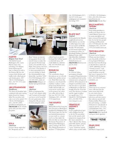 PROOF American There may be an extensive wine collection, but the menu more than holds its own with eclectic charcuterie and cheese selections, and tasty entrees like vadouvan spiced wild Alaskan halibut. Warm, lowkey and inviting – a reliable destination to take friends or someone special. 775 G St., NW,Washington, D.C.; 202737-7663; www.proofdc.com Creative dish: Spicy meatballs with goat cheese agnolotti