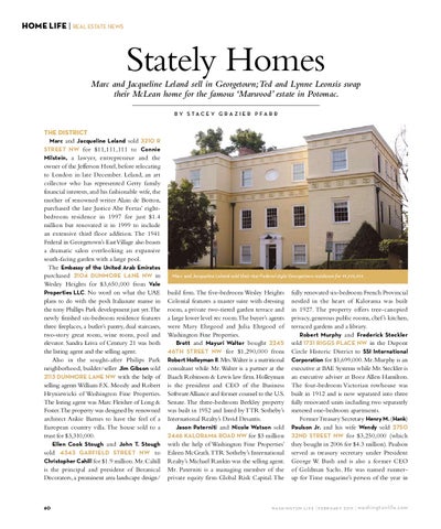 Stately Homes Marc and Jacqueline Leland sell in Georgetown; Ted and Lynne Leonsis swap their McLean home for the famous ‘Marwood’ estate in Potomac. By Stac e y G r a z i e r P fa r r