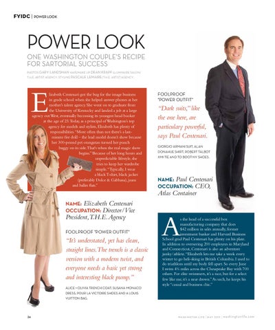 lizabeth Centenari got the bug for the image business in grade school when she helped answer phones at her mother’s talent agency. She went on to graduate from the University of Kentucky and landed a job at a large agency out West, eventually becoming its youngest head booker at the age of 23. Today, as a principal of Washington’s top agency for models and stylists, Elizabeth has plenty of responsibilities. “More often than not there’s a lastminute fire drill – the lead model doesn’t show because her 300-pound pet orangutan turned her punch buggy on its side. That's when the real magic show begins.” Because of her long hours and unpredictable lifestyle, she tries to keep her wardrobe simple. “Typically, I wear a black T-shirt, black jacket (preferably Dolce & Gabbana), jeans and ballet flats.”