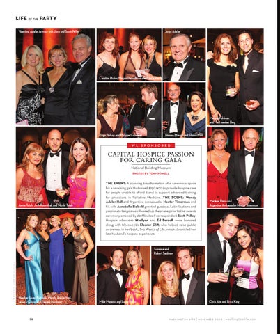 for a smashing gala that raised $750,000 to provide hospice care for people unable to afford it and to support advanced training for physicians in Palliative Medicine. THE SCENE Wendy Adeler-Hall and Argentine Ambassador Hector Timerman and his wife Annabelle Sielecki greeted guests as Latin libations and passionate tango music livened up the scene prior to the awards ceremony emceed by 60 Minutes II correspondent Sco Pelley. Hospice advocates Marilynn and Ed Bersoff were honored along with Newsweek’s Eleanor Cli , who helped raise public awareness in her book, Two Weeks of Life, which chronicled her late husband’s hospice experience.