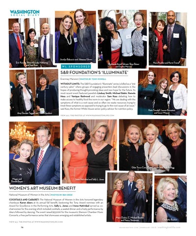 S&R FOUNDATION’S ‘ILLUMINATE’ Evermay Mansion | PHOTOS BY TONY POWELL WITHOUT LIMITS: The S&R Foundation’s “Illuminate” series is billed as a “21st century salon” where groups of engaging presenters lead discussions in the hopes of producing thought-provoking ideas and new hope for the future. Its most recent event featured panelists Lindsay Smith, Michael Babin, Pamela Hess and Yanique Redwood and moderator Sam Kass debating how to make access to healthy food the norm in our region. “We are dealing with the symptoms of what is a root cause and so o<en we waste resources trying to treat these symptoms as opposed to trying to go to the root cause of an issue,” said Kass, the former White House senior policy advisor for nutrition policy.