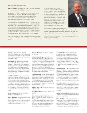 James A. Elliott ’68 (1946-2009) James A. Elliott ’68, a loyal alumnus and trustee of the College, passed away unexpectedly on Sunday, May 3, 2009, at the age of 62. Upon graduation from W&J in 1968, Elliott was commissioned as a second lieutenant in the U.S. Army. From 1969-1970, he served in the Korean Demilitarized Zone as platoon leader, executive officer, and company commander before being honored with the Army Commendation Medal and attaining the rank of major in the U.S. Army Reserves. Following service to his country, he earned an M.B.A. from Rutgers University and accepted a position as an investment analyst for the Ford Motor Company. He continued to seek out knowledge and education, earning a Master of Arts degree in economics from Eastern Michigan University in 1977. Elliott and his family moved to Dallas in 1980 where they have resided ever since. After serving as vice president for institutional sales for Salomon Brothers and also at Credit Suisse First Boston, Elliott joined Merrill Lynch & Co., Inc. in 1994 as the first vice president for investments, a position he held until his death. Active in his community, Elliott served in many philanthropic positions in Dallas, including Preston Hollow Presbyterian Church, Hope Cottage, and The Hockaday School.