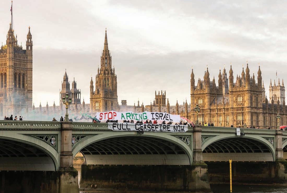 Pro‐Palestinian activists from the Free Palestine Coalition stand in front of Parliament on Westminster Bridge with banners calling on the UK government to demand the cessation of arms sales to Israel and a full ceasefire in Gaza on Nov. 29, 2023 in London, United Kingdom. The action took place on the U.N. Inter‐national Day of Solidarity with the Palestinian People, which has been observed on or around Nov. 29 every year since its creation in 1977.