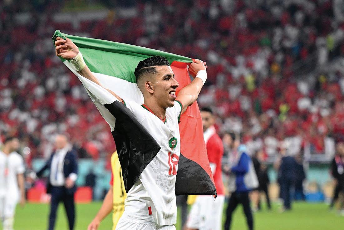 Morocco’s defender #18 Jawad El Yamiq waves the Palestinian flag after his team won the Qatar 2022 World Cup Group F football match between Canada and Morocco at the Al‐Thumama Stadium in Doha on Dec. 1, 2022, to advance to the round of 16. Moroccan fans were chanting for Palestine and Morocco. PHOTO BY NATALIA KOLESNIKOVA/AFP VIA GETTY IMAGEStinian symbols and chants, the question puzzled them. “Palestine is in our blood. The love for Palestine runs in our veins,” an older man answered, overcome with emotion.