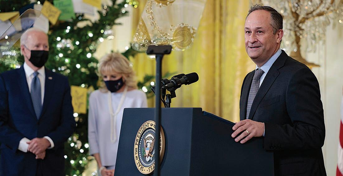 Second Gentleman Doug Emhoff delivers remarks before a menorah lighting ceremony in celebration of Hanukkah in the East Room of the White House on Dec. 1, 2021 in Washington, DC. Jews in America are an integral part of their nation and do not consider themselves living in exile.