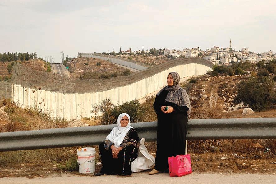 Palestinian women gather to wait near an Israeli checkpoint near Beit A’wa village on the outskirts of Al‐Khalil (Hebron) in the West Bank, after receiving special Israeli permission to harvest their own olive trees on the other side of the wall, on Oct. 13, 2021.