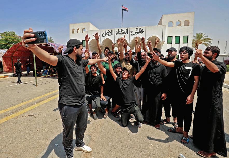 PHOTO BY AHMAD AL-RUBAYE/AFP VIA GETTY IMAGES Supporters of Muqtada al‐Sadr gather for a “selfie” group picture outside the headquarters of the Supreme Judicial Council, Iraq’s highest judicial body, in Baghdad on Aug. 23, 2022. They are demanding the dis ‐solution of parliament and new elections. continue to suffer from a variety of wars driven and shaped mostly by violent Western cynicism and rogue Middle Eastern authoritarianism. It is heart-wrenching to see Iraqis turn against each other again and again, as if politics is war by other means. It is not. If anything, politics is and must be the antidote for war and violence in the region and beyond. ■