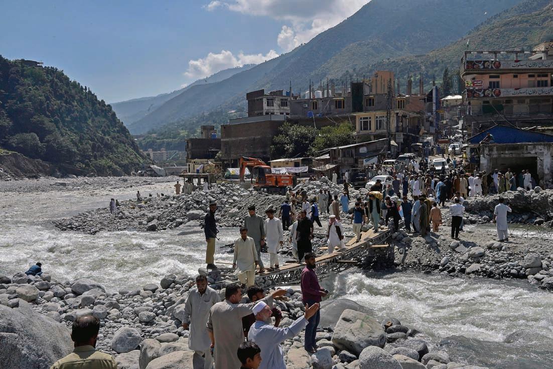 Local residents cross a temporary footbridge, on Aug. 31, 2022, after heavy rains in the Swat Valley in the Khyber Pakhtunkhwa province.