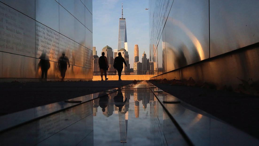 The sun sets on lower Manhattan and One World Trade Center in New York City as people walk through the Empty Sky 9/11 Memorial in Liberty State Park on July 19, 2022, in Jersey City, New Jersey.